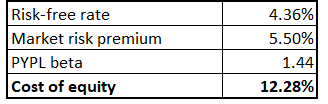 Looking only at valuation ratios is never enough for me, so I proceed with the discounted cash flow [DCF] simulation. The CAPM approach helps me in figuring out the discount rate, which is the cost of equity. According to the below formula, PYPL's cost of equity is 12.28%.