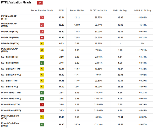 PYPL rallied by around 50% over the last 12 months, notably outperforming the broader U.S. stock market. Performance in 2024 is also ahead of the S&P 500 index with a 26% YTD rally. Despite a low "D" valuation grade from Seeking Alpha Quant, I find PYPL's valuation ratios extremely attractive since they are significantly lower compared to historical averages.