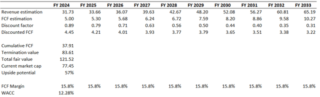 As usual, I take the next decade's revenue forecast from consensus and incorporate it into my DCF. I think that this trajectory is fair enough because an 8.3% CAGR for the next decade looks conservative compared to the previous decade's around 15% revenue CAGR. The last five years' FCF margin average is 15.8%, and I use this level flat for the entire decade.