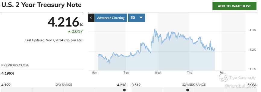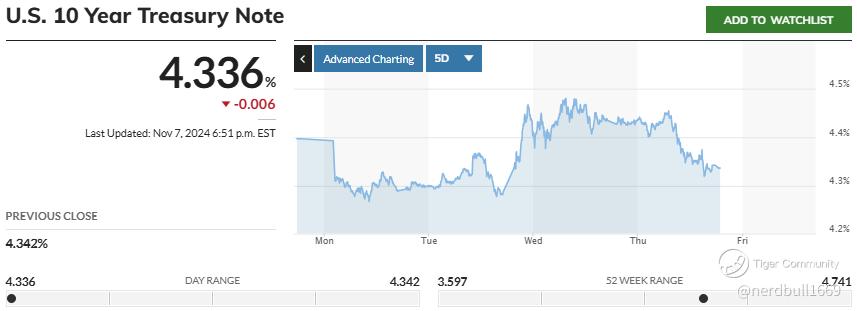 The yield on 10-year Treasurys, which has risen in recent weeks as investors have scaled back their expectations about how aggressive the Fed will be in cutting rates, was at 4.336% recently, down six basis points from 4.43% on Wednesday when it hit its highest level since early early July. 2-year note yield was up seventeen basis points and closed 4.216%.