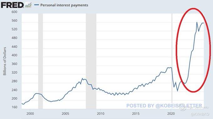 US personal interest payments hit $556 BILLION in September, the second-largest in history. Since 2022, Americans' interest costs have DOUBLED. Personal interest as a percentage of disposable personal income is now at 2.5%, near the highest since the 2008 Financial Crisis. This metric is also materially higher than the 2.0% seen in the 1970s when interest rates were almost twice as much as the current 4.75%-5.00% range. All while the total household debt sits at a record $17.8 TRILLION. Consumers are drowning in interest expense.