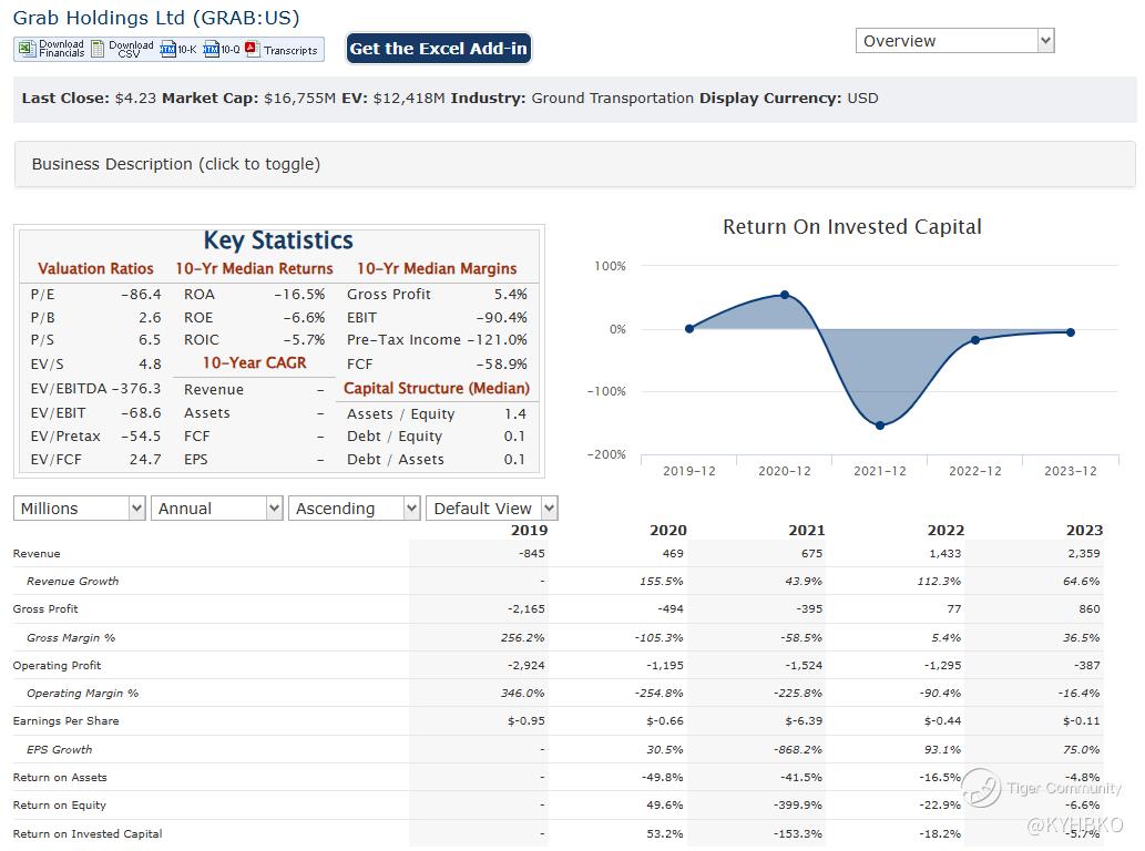 The gross profit grew from a loss of $2,165M (2019) to $860M (2023).