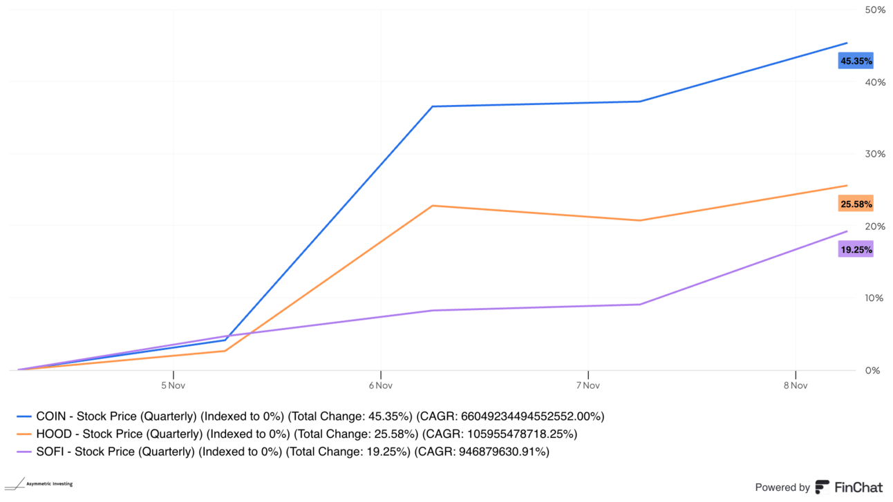 This week, three of the Asymmetric Universe stocks had great weeks primarily because of speculation. I continue to be bullish on them, but I’m bullish because of what I see over the next decade, or more, not what I see in the next 4 years. $Coinbase Global, Inc.(COIN)$ $Robinhood(HOOD)$ $SoFi Technologies Inc.(SOFI)$