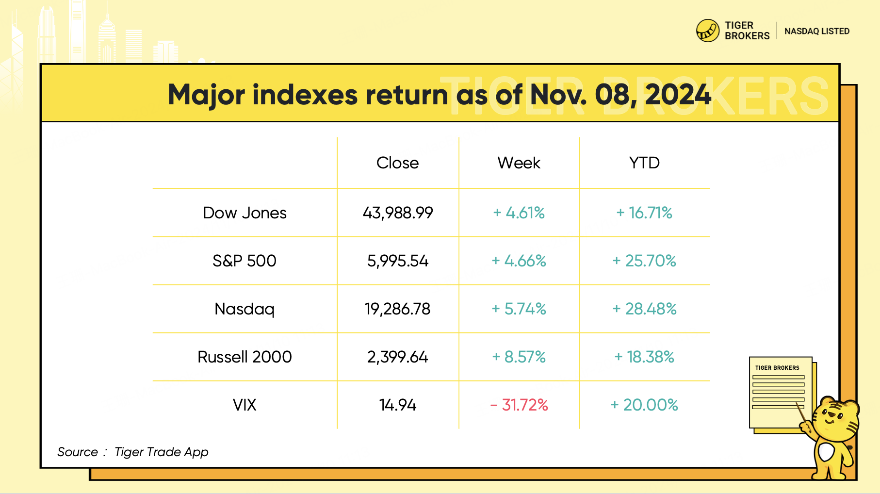 The Dow had its best post-election gain since 1896, hitting record highs along with the $.SPX(.SPX)$ and $.IXIC(.IXIC)$ . Small caps index-Russell 2000 $iShares Russell 2000 ETF(IWM)$ skyrocketed 8.57% over the week. Since 2024, the benchmark and Nasdaq have risen 25.7% and 28.5%, while the Dow was up 16.7% this year.