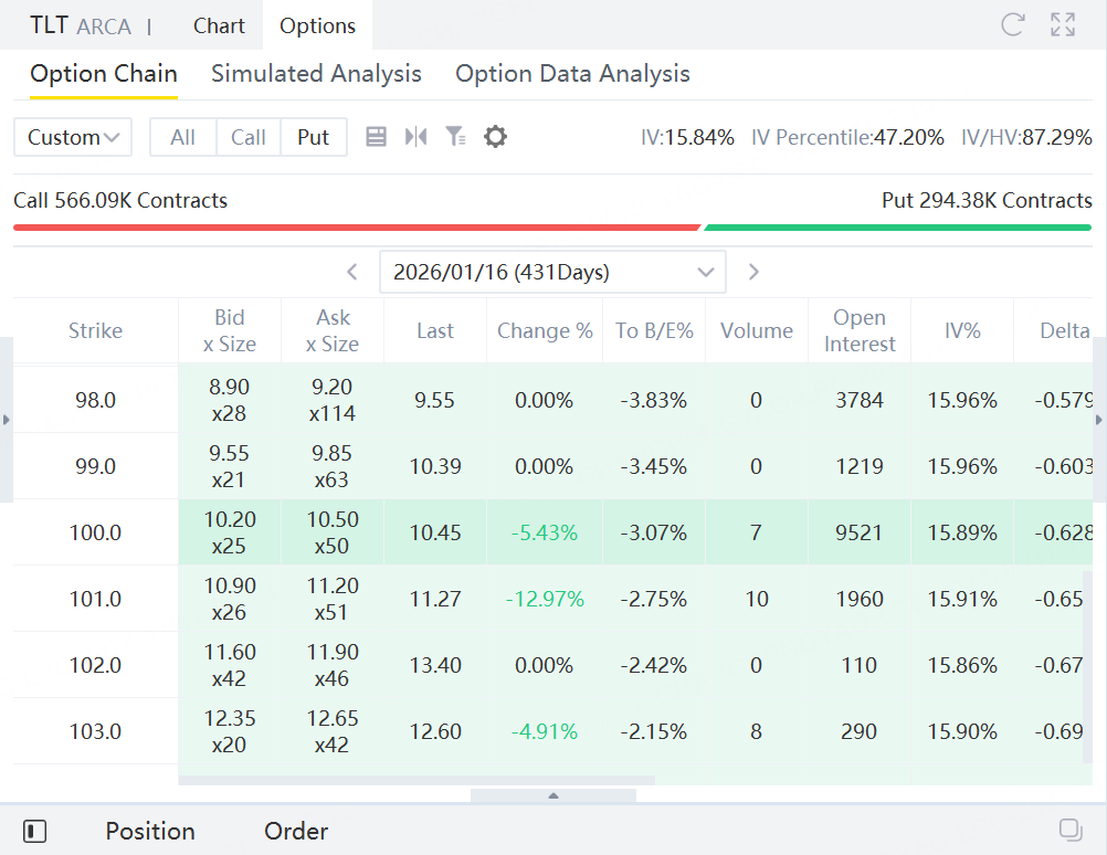 By selling in-the-money put options, investors can take a stronger long position on Treasury bonds. Optimistic investors could choose to sell put options with a strike price of 100 for the same expiration date. If executed, investors could benefit from any price increase between 92.5 and 100 in Treasury bonds by January 16, 2026, and would gain additional premium compared to stocks.