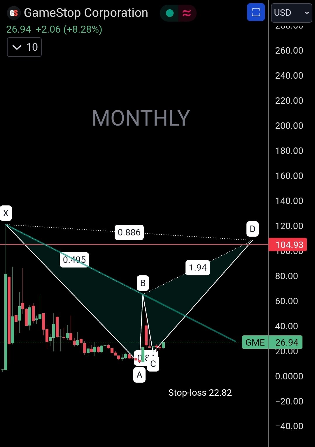 $GameStop(GME)$ Potential bat pattern developing on GME. Projected price target 104. Need to break above descending trend line for confirmation! Pay attention to stop.