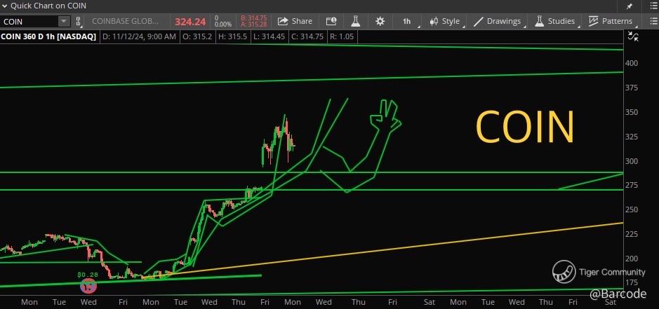 News and Market Sentiment: There have been reports suggesting that the Trump Administration's favorable policies towards the cryptocurrency industry have increased optimism among investors. This has led to a "fear of missing out" sentiment, creating a positive market environment for Coinbase and other cryptocurrency-related stocks.