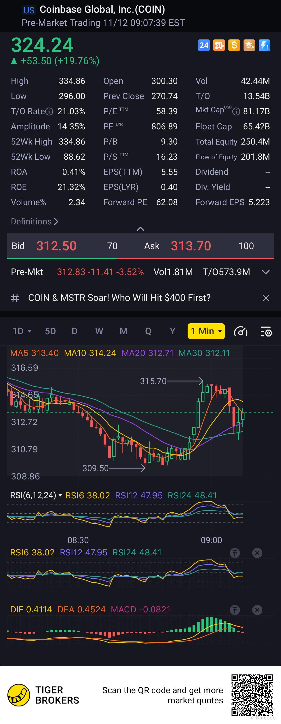 $ COIN $300.70 to $308.10 is 4 hour top.