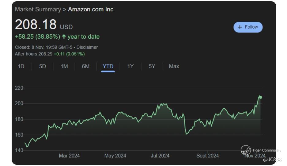 As of Mon, 11 Nov 2024, AMZN was trading at $206.84, reflecting gains of 38% in 2024.