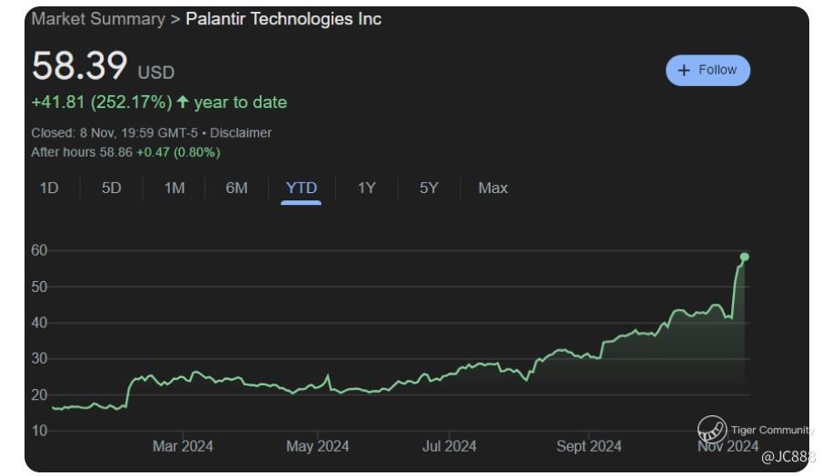As of Mon, 11 Nov 2024 closing, PLTR was trading at $60.24, gaining +263.33% in 2024. Intraday, it hit its 52-week high of $62.08.