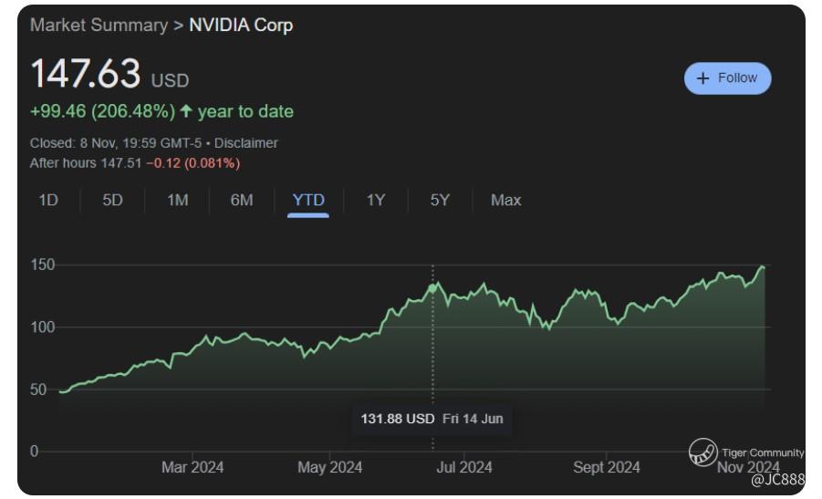 As of Mon, 11 Nov 2024, NVDA was trading at $145.26, reflecting a YTD return of +201.56%.