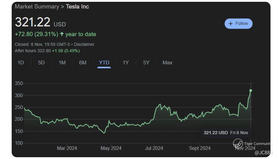 As of Mon, 11 Nov 2024 endday, TSLA closed at $350, up almost +40.89% YTD. This is the first time for a long time since Tesla hit above $300, its 25 August 2022 3-for-1 forward stock split price.