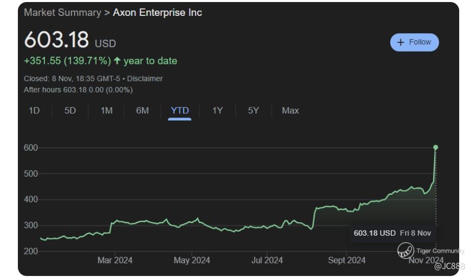 At the close of markets on Mon, 11 Nov 2024, AXON was valued at $616.14, surging +144.86% in 2024.