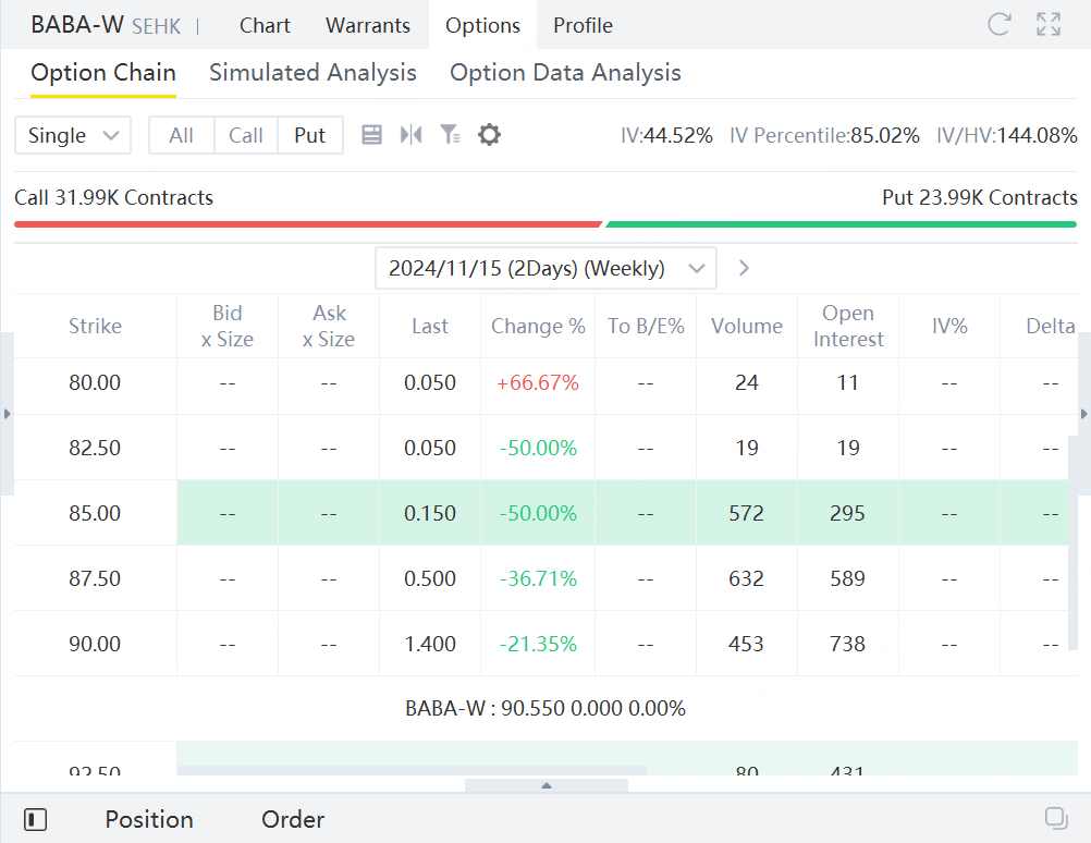 Alibaba’s stock is currently trading at 90.1 HKD. Investors can implement a short strangle as follows: