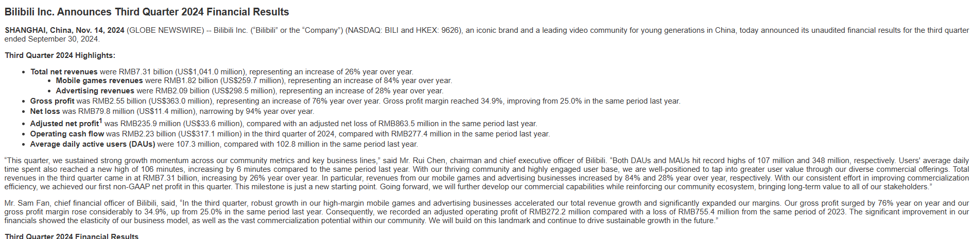 Driven by the success of San Guo, Mobile Game revenue grew 84% y/y in 3Q (vs. +13% in 2Q). BILI believesSan Guo will have a long lifecycle of over five years and will focus on its operation in 2025.
