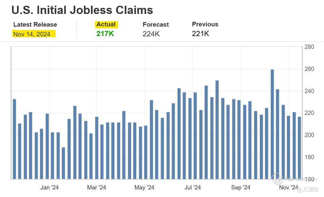For week ending 9 Nov 2024, US weekly jobless claims has fallen by -4,000 to 217,000 claims vs analysts’ expectations of 224,000 vs the week prior’s claims of 221,000.