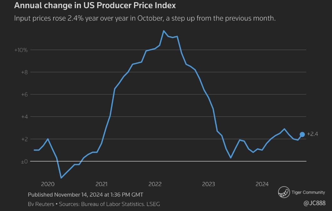 A rise in the headline PPI to 2.4% and the core PPI to 3.1% indicates that producer prices are also increasing.