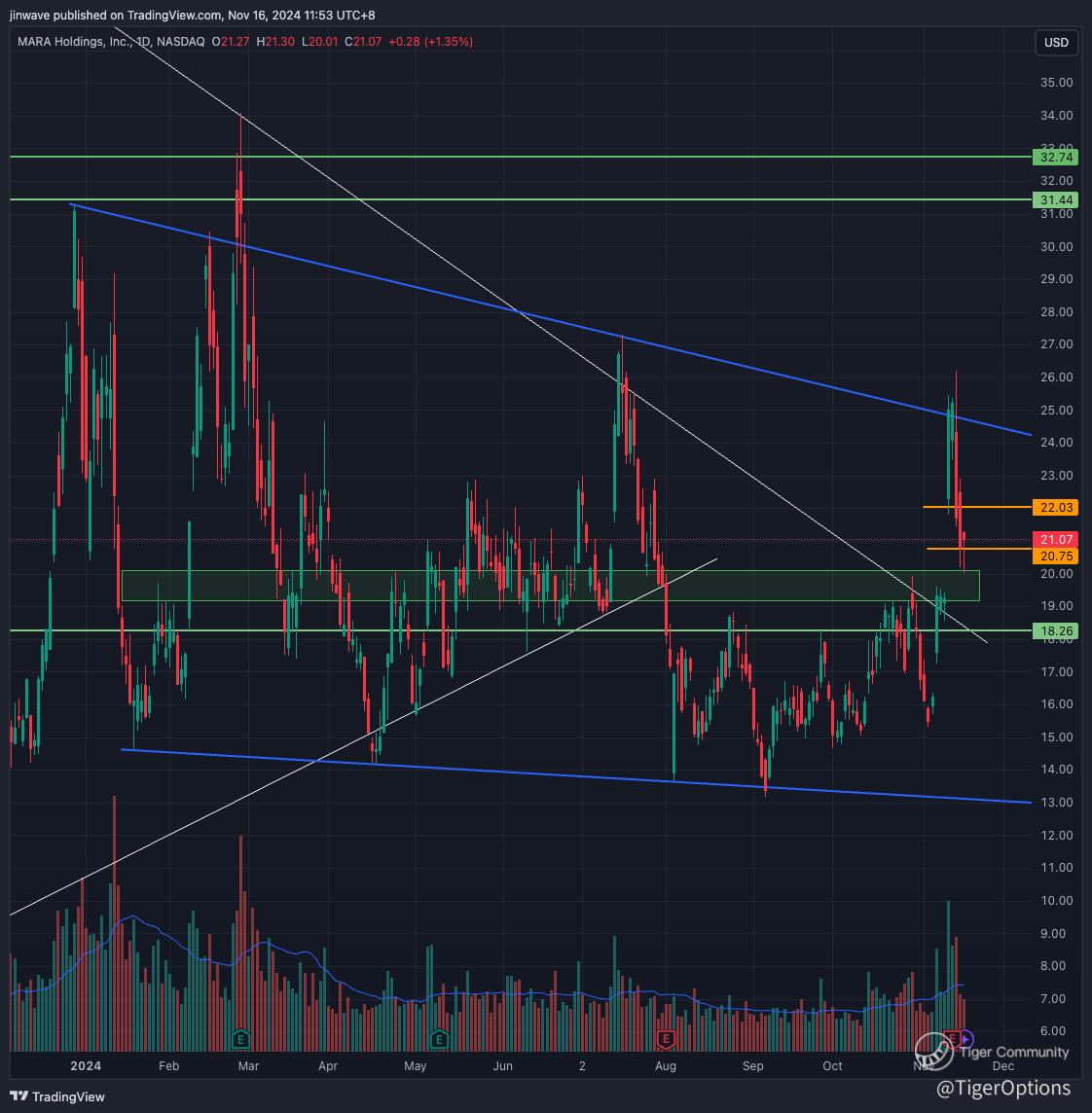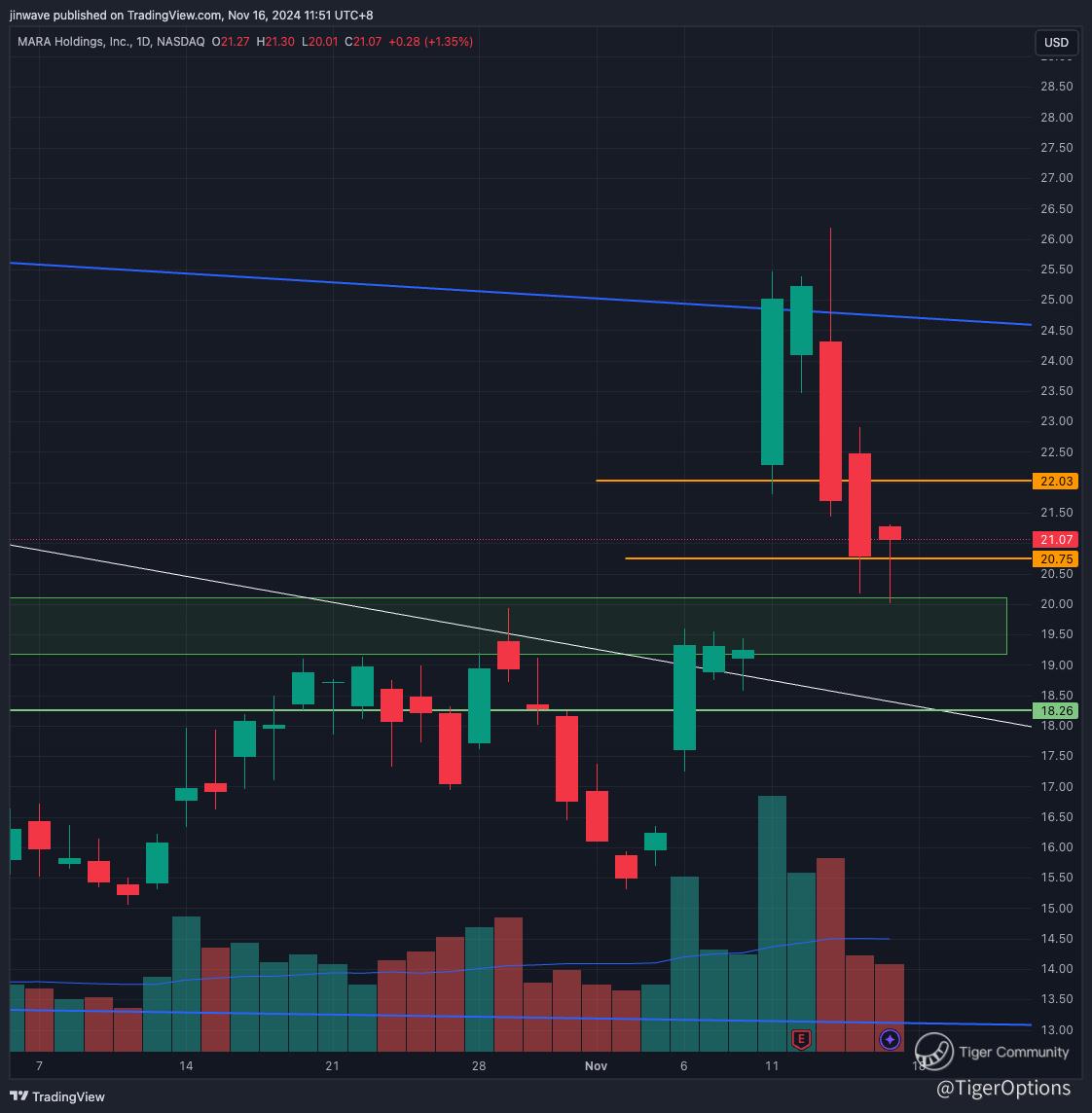 I’ve been tracking $Marathon Digital Holdings Inc(MARA)$ closely, and despite the initial sell-off following its wider-than-expected third-quarter loss, I believe there’s a compelling case for a potential reversal. The stock’s post-election rally faced a strong pullback after the earnings report missed expectations, but a closer look at the candlestick patterns and the overall market context suggests we could be witnessing a bottoming process.