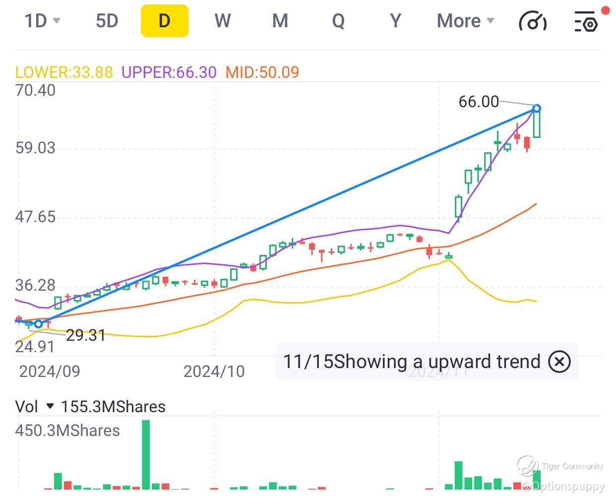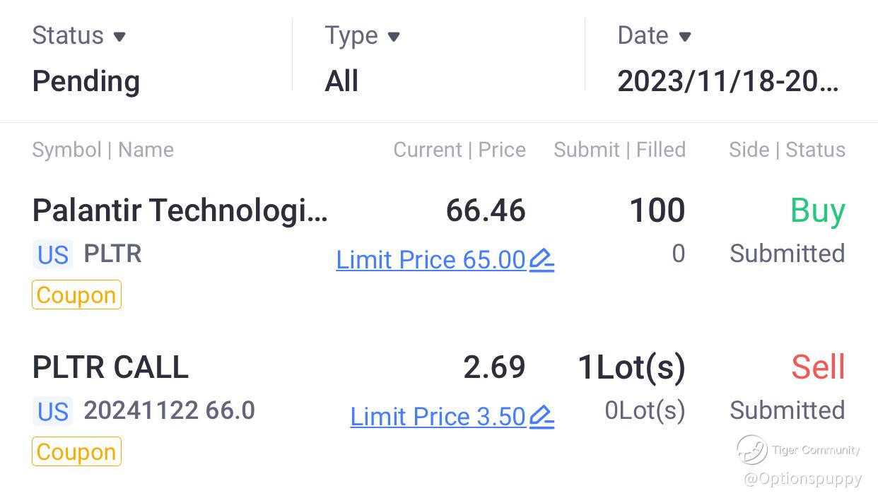 Once the market opens, I plan to revise my buy price for 100 shares closer to the current trading price of $67. This ensures my order gets executed, allowing me to immediately sell a covered call contract. The call will have a $66 strike price with a premium of over $3, which aligns with current trends in PLTR’s options market.$Palantir Technologies Inc.(PLTR)$