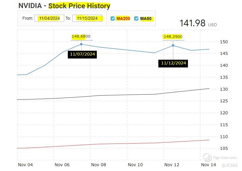 While most US stocks continued to pullback, Nvidia turned around and rose, peaking for the 2nd time within 2 weeks on 12 Nov 2024 at $148.29 - $0.59 shy of 7 Nov 2024’s peak.
