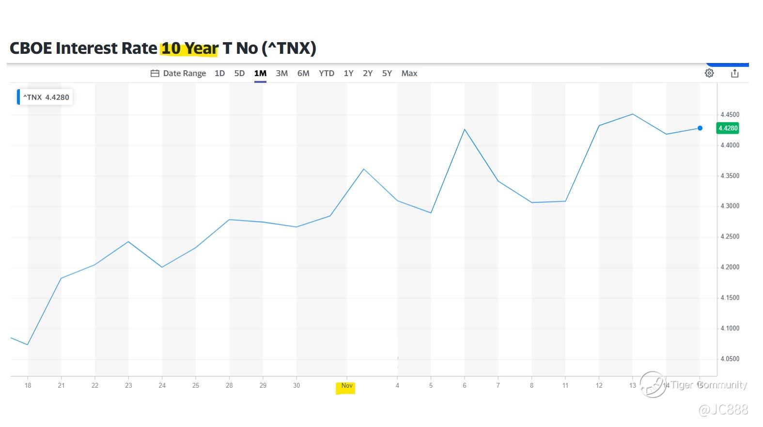 The 10-year Treasury (^TNX) yield rose by +80 basis points between that date and the days following the election to trade near 4.5%.
