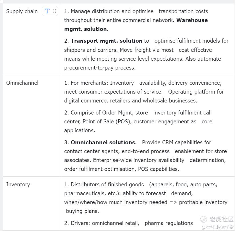 The company designs, builds and delivers supply chain commerce solutions globally. The company offers products through direct sales personnel and partnership agreements with various organizations. The company operates in the Americas, Europe, the Middle East, Africa, and the Asia Pacific. Company’s revenue centers around three main buckets – supply chain, omnichannel commerce, and inventory management. 3 products – OMS, TMS, WMS. Customers include Walmart, Loreal, Nike, and Home Depot. Expertise in apparel-based businesses such as Under Armour, Lululemon, Adidas, and Crocs.