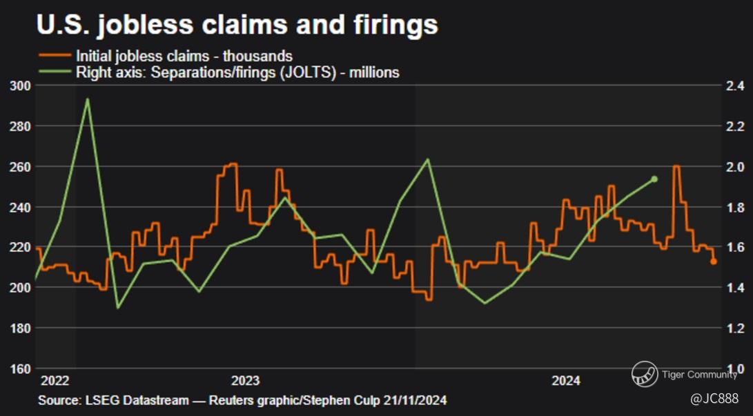 For week ending 16 Nov 2024, US weekly jobless claims came in at 213,000 vs Wall Street estimates of 220,000 and last’s week revised claims of 219,00.