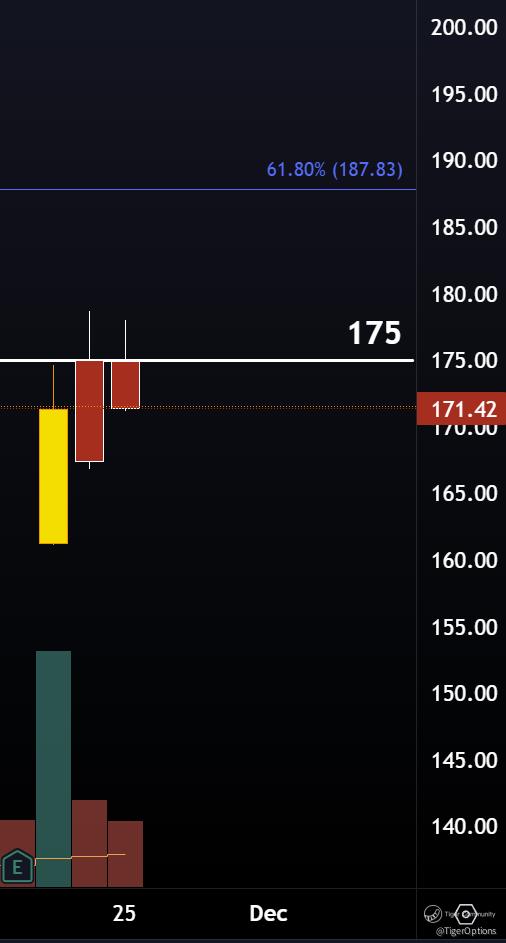 Resistance at $175: The stock has repeatedly tested the $175 level but has been rejected each time, trading lower afterward. This suggests a strong supply zone at that price.