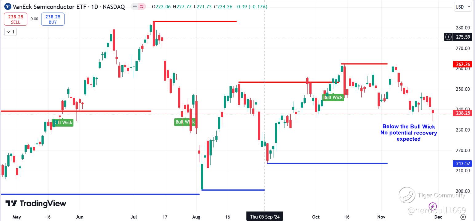 Two months later, in October, we saw that SMH ETF has stabilized above critical rising moving averages and pared losses, now sitting just 13.6% below its peak, and we saw a Bull wick appeared, formed a bullish setup, post two consecutive higher lows and consolidating around the $250 level, both close to a potential breakout zone, which we saw two new highs in mid-October above $260 and after the U.S. election.