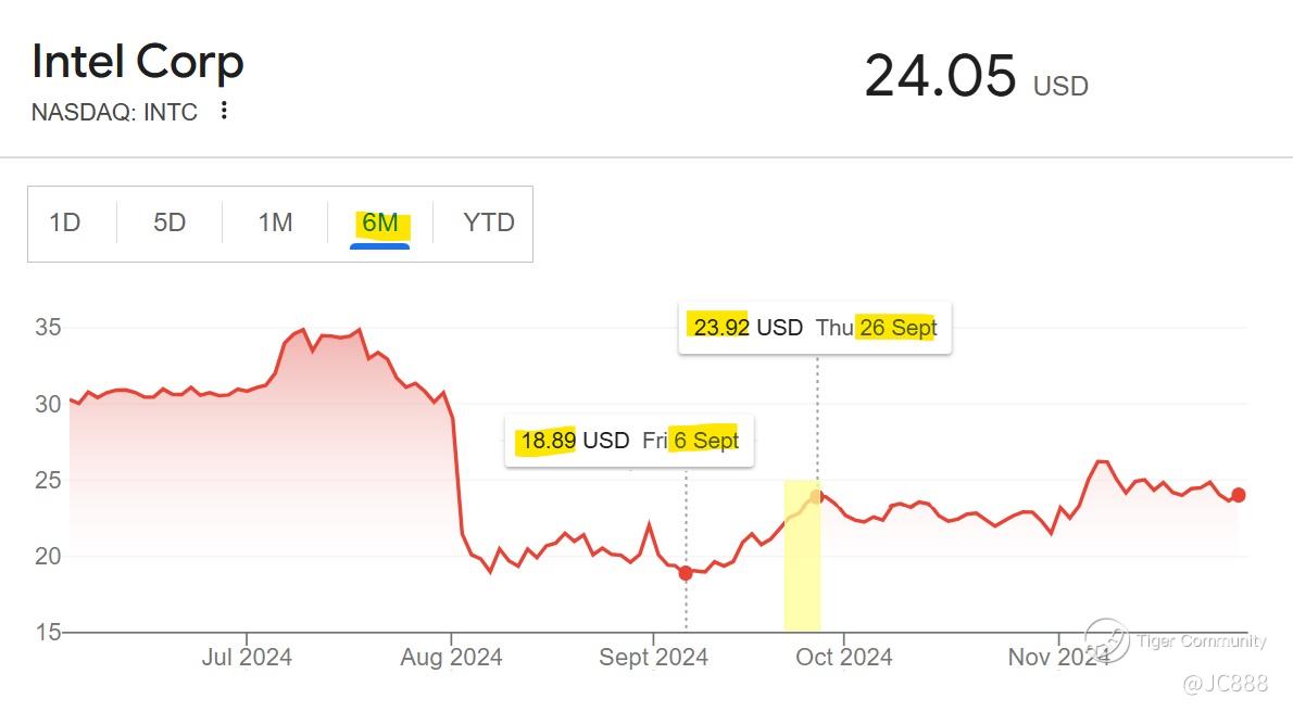 It was just the right dose of ‘scandal’ needed to push INTC out of its doldrum (yellow highlight) that saw the former chip giant sank to its lowest at $18.89 on 06 Sep 2024. (see below)