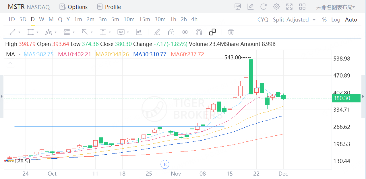 In this session, let's talk about a particularly volatile stock recently: $MicroStrategy(MSTR)$ . This stock, deeply tied to Bitcoin, has seen a remarkable surge in its price, driven by Bitcoin's skyrocketing rally. Over the course of just one month, its stock price shot up by 58%. However, since entering December, the price has been oscillating widely between $350 and $420.