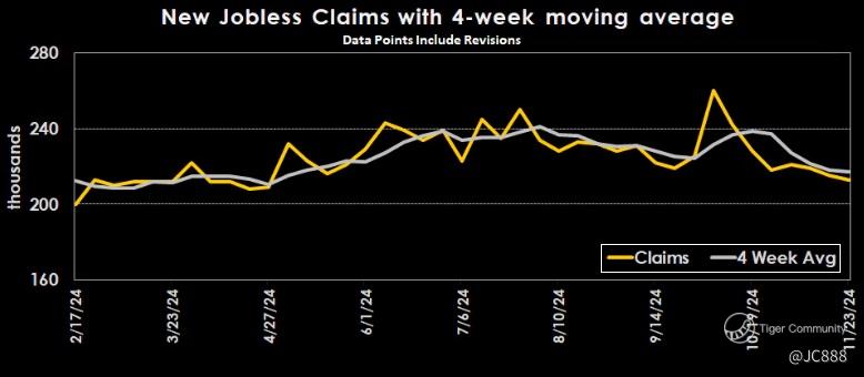 23 Nov 2024’s recorded claims was (still) below the consensus of 217,000 — based on the Econoday survey of forecasters.