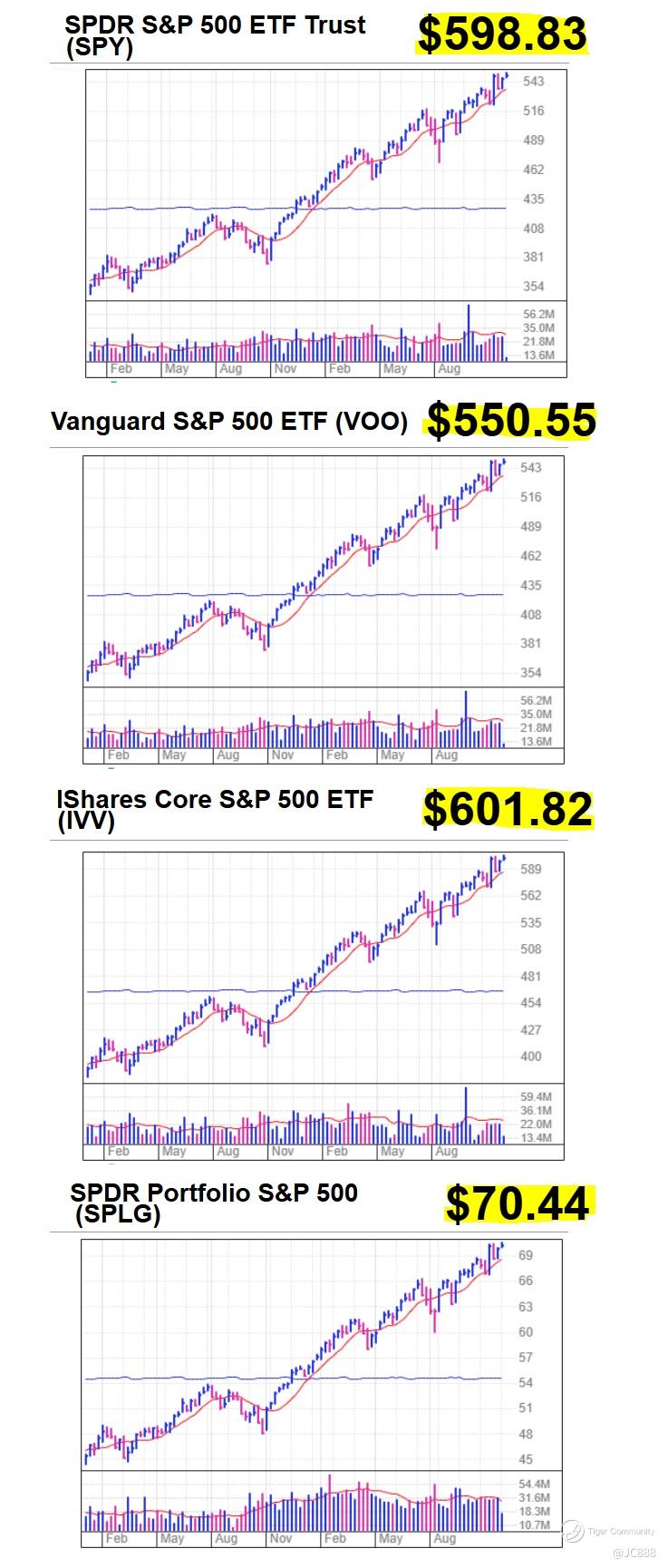 The 4 ETFs (SPY, VOO, IVV, and SPLG) track the same S&P 500 index.