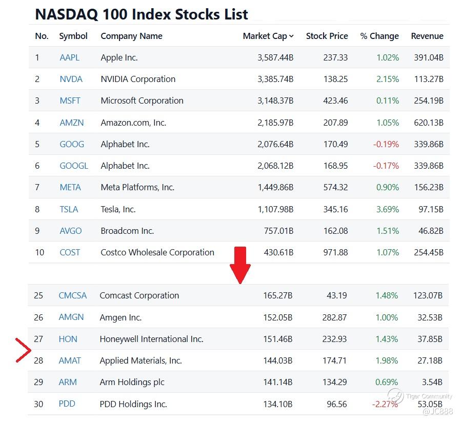 Ignoring all companies that maybe included in the revised Nasdaq-100, hypothetically PLTR (if included) should sit somewhere between Honeywell (HON)$ and Applied Materials (AMAT)$., that is position #28. (see below for visualization)