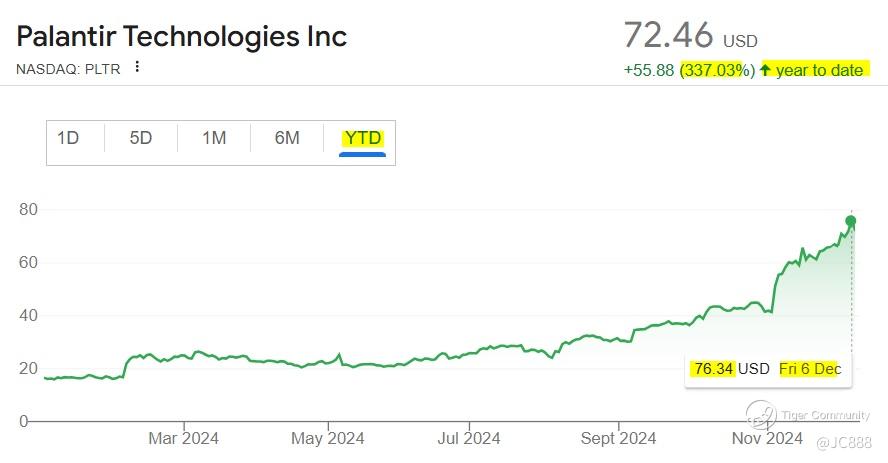When trading ended on Fri, 13 Dec 2024, PLTR was at $76.07; just shy of its 6 Dec $76.34 peak.
