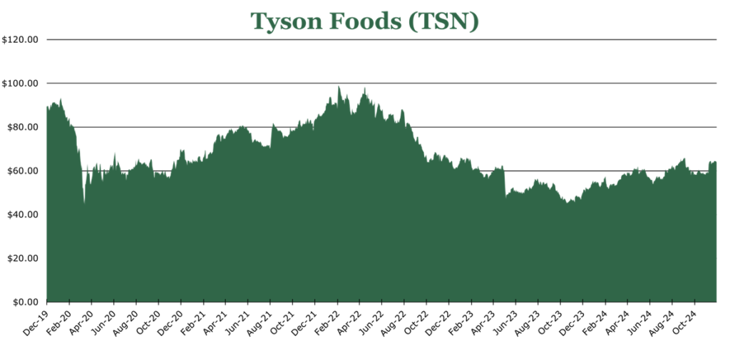 Despite the challenging environment, Tyson generated $1.5 billion in free cash. For 2025, it expects to generate a similar level of free cash flow, which should mean the dividend is safe. Currently Tyson pays 3.14% yield, or a payout ratio of 63.2%. In early November Tyson raised its dividend by 2%, making 13 years of consecutive dividend increases. Given management is confident they are at the bottom of the cycle, we expect the dividend to increase at or just above 2% in fiscal 2025 depending on conditions in the second half of the year.