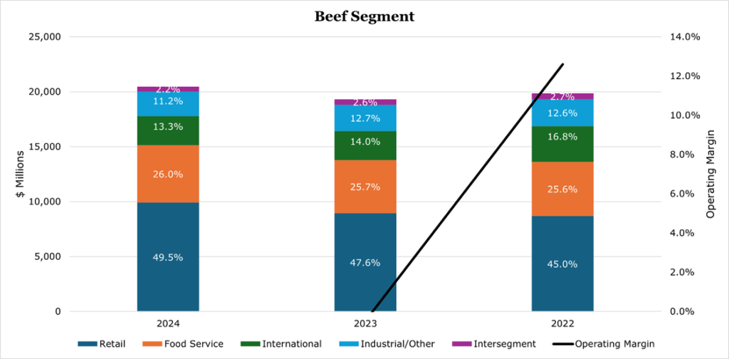 For the entire company, volumes were flat year over year, but still saw revenue growth of 0.8% thanks to increases in average sales price of 0.6%. Overall operating margins for the fiscal year ending September 2024 were 2.6%, a slight recovery year over year, but still at the bottom end of the cycle. Given the overlap in the downcycle of Pork and Beef, margins will remain challenged until at least 2026.