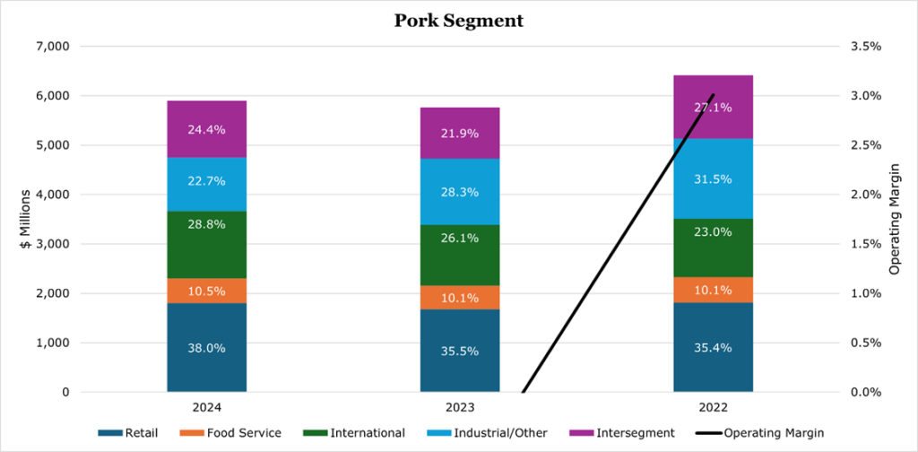 As of the fiscal year ending September 2024, the pork segment represented 11.1% of revenues. Revenues saw a moderate increase of 2.3% for the fiscal year ending September 2024, driven by a 3.8% increase in volumes. Segment operating margins ended the year at just below breakeven at -0.67%, it was a 28.7% year-over-year increase given the decreases in input prices.