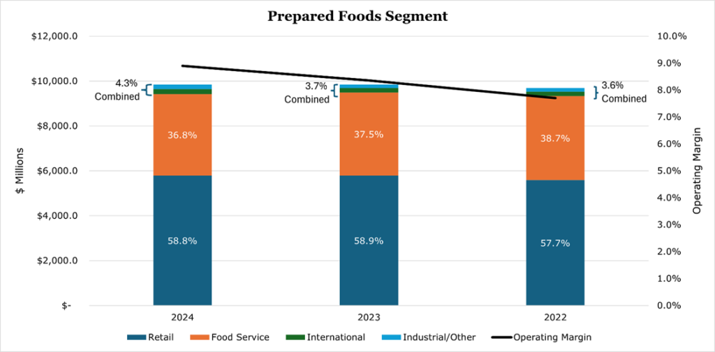 Prepared foods contains prepared foods like Jimmy Dean, lunch meats, and pre-cooked items. As of the fiscal year ending September 2024, it represented 18.5% of revenues. Topline growth in the segment was 1.0% year over year, with segment operating margins expanding 56bps to end the year at 8.9%. Average sales price did decrease due to mix changes, but this was fully offset by decreasing input costs.