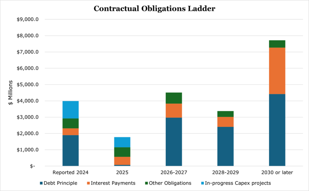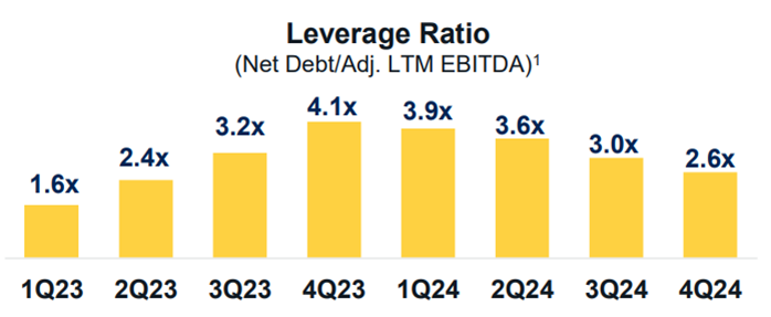 Targeting leverage ratio of net debt to EBITDA of under 2.0x, currently 2.6x with most debt maturing past 2027.