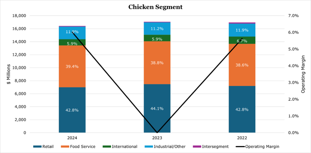The chicken segment contains the vertically integrated chicken processing arm, as well as some pre-packaged chicken products like chicken nuggets. As of the fiscal year ending September 2024, it represented 30.8% of revenues. Revenues in the segment had a -3.7% year over year decline, seeing weakness sales price down 2.4% and volumes down 2.2%. However, segment operating margins recovered to end the year in the positive, generating 6.0% operating margins.