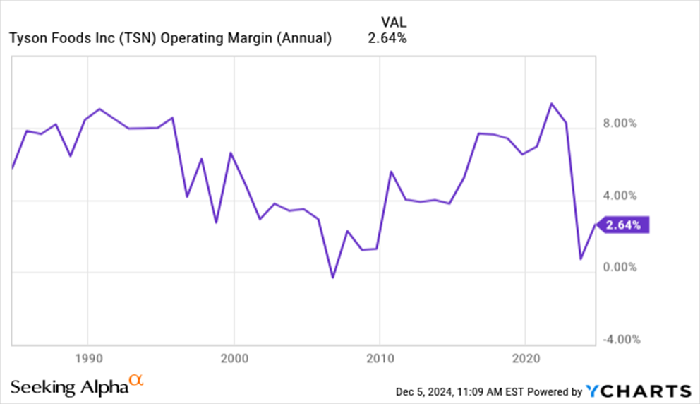In the non-value-added areas, like raw beef or pork processing, Tyson has very little control of the price of inputs. Given the commoditized and substitutable nature of proteins, it also has very little pricing power. During the quarter ending September 2024 earnings call, management indicated that around 85% of these businesses are at the mercy of market prices and they can do only loss-mitigation during downcycles.