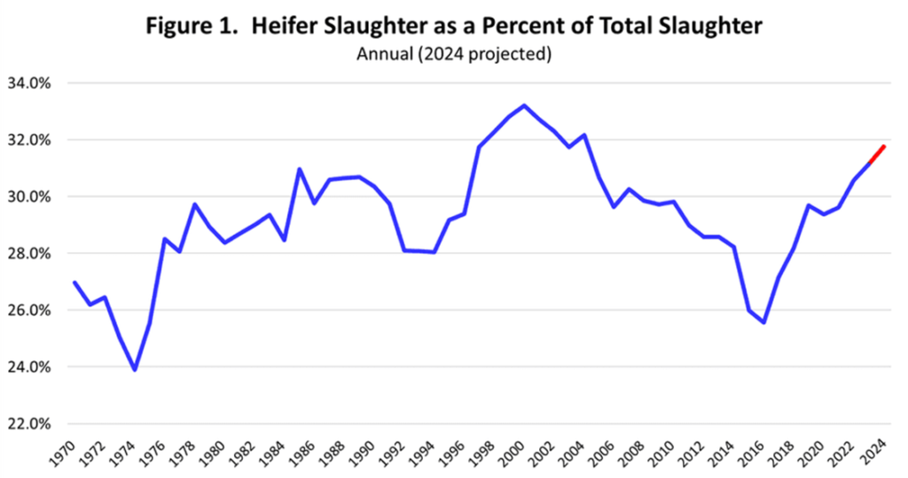 Over the last 5 years a mixture of drought, fertilizer shortages, tightening feed supplies, and economic hardship tightening consumer’s ability to spend on more expensive cuts have driven inventories to the lowest level in 73 years. There is little pressure for ranchers to expand their herds amid high interest rates and uncertainty regarding feed supply, which has extended the down part of the beef cycle and pushed the slaughter of Heifer (breeding cows) to all-time highs.