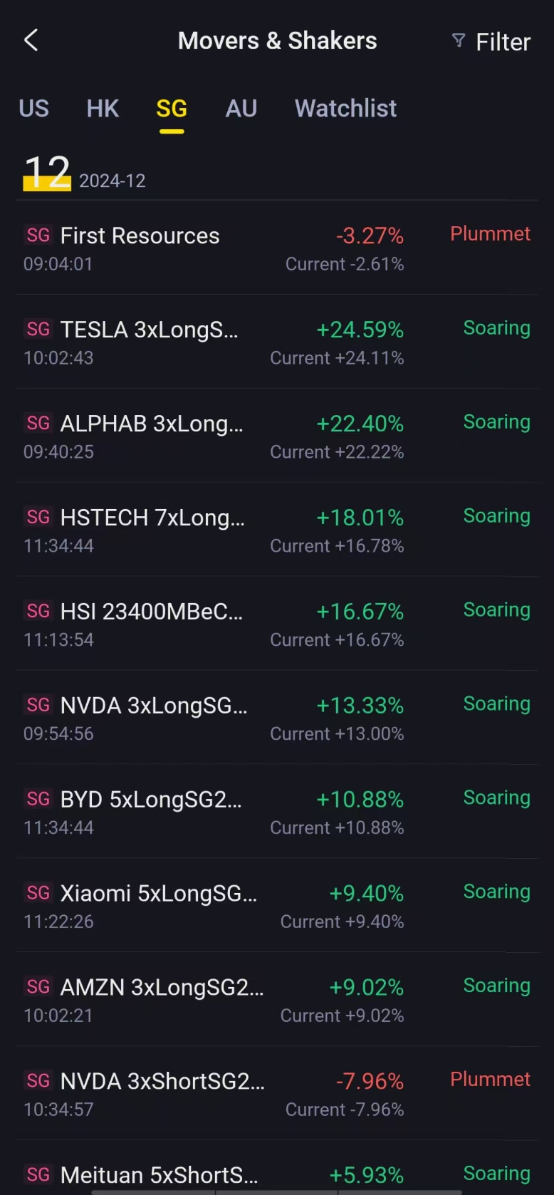 Looks like tha $ALPHAB 3xLongSG261006(USJW.SI)$ and $TESLA 3xLongSG261006(TSYW.SI)$ were more popular in the market with gains over 20%. However, $Meta Platforms, Inc.(META)$ ‘s DLC $META 3xLongSG261006(USDW.SI)$ had no trading and the day change % is 0. $Apple(AAPL)$ ‘s $APPLE 3xLongSG261006(MACW.SI)$ just gained 1.26%.