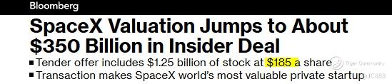 According to an internal email seen by Bloomberg, the privately owned US business, in which Musk owns a 42% stake, and its backers are buying the stock at $185 a share, up from $112 a few months ago.