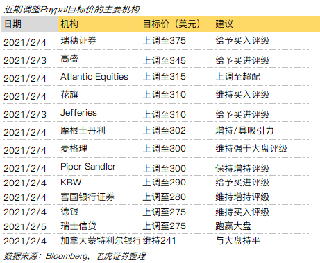 在最新更新評級數據的機構裏面,日本瑞穗證券(Mizuho Securities)給出了最高目標價,認爲未來12個月Paypaly有機會衝擊375關卡,理由是Paypaly已經轉變爲“超越支付、商業和金融服務的終極金融‘超級應用程序’”,也十分看好比特幣交易帶來的潛力。