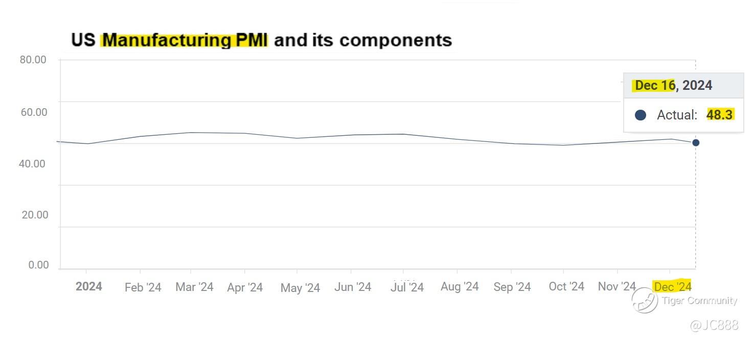 On 16 Dec 2024, the S&P Global Flash US Manufacturing PMI slid to 48.3 (December) from 49.7 (November), coming in below economist’s 49.8 polled by Reuters.