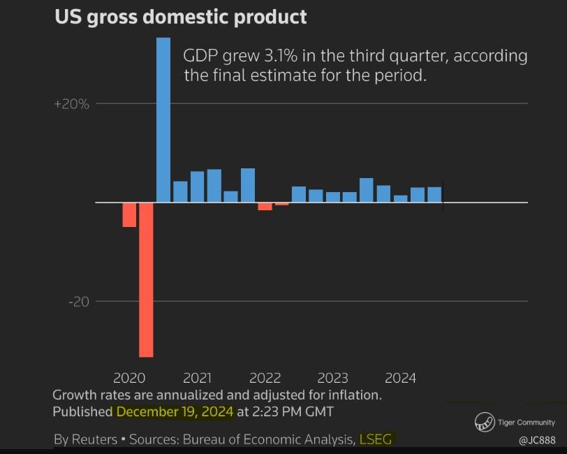 Data showed US economy grew by an annualized 3.1% in Q3 2024, beating expectations from economists polled by The Wall Street Journal.