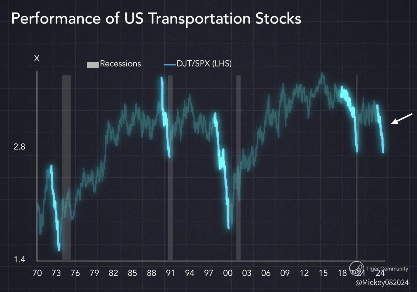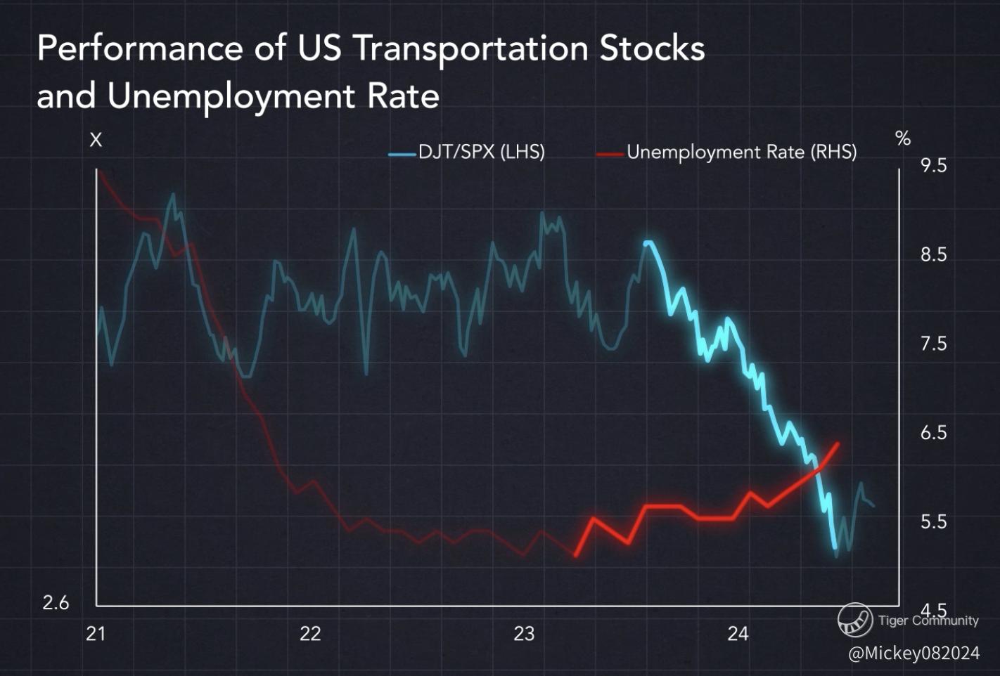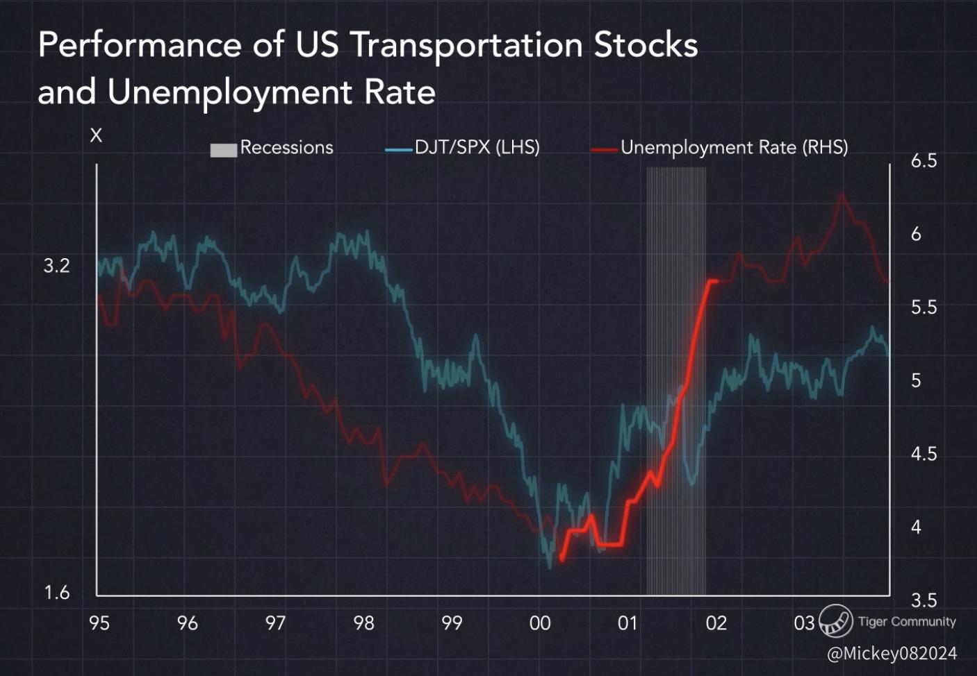 Fast forward to 2024: We've seen one of the worst performances of transportation stocks since 1999. The unemployment rate in the United States is already beginning to rise.