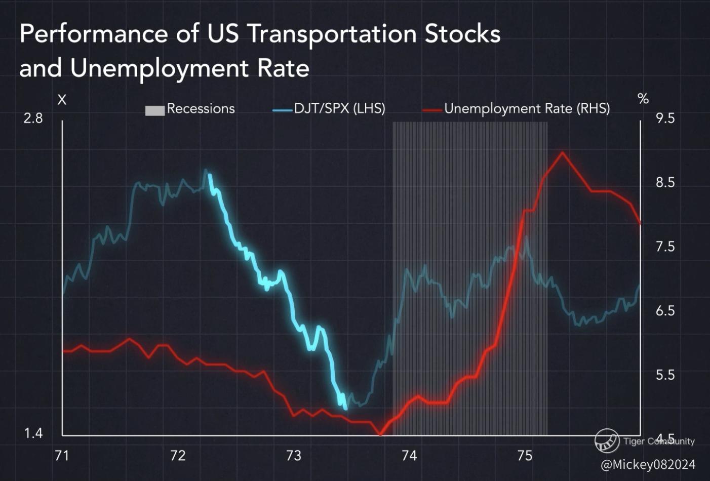 The unemployment rate began to rise shortly after severe under performance of transportation stocks in 1973.